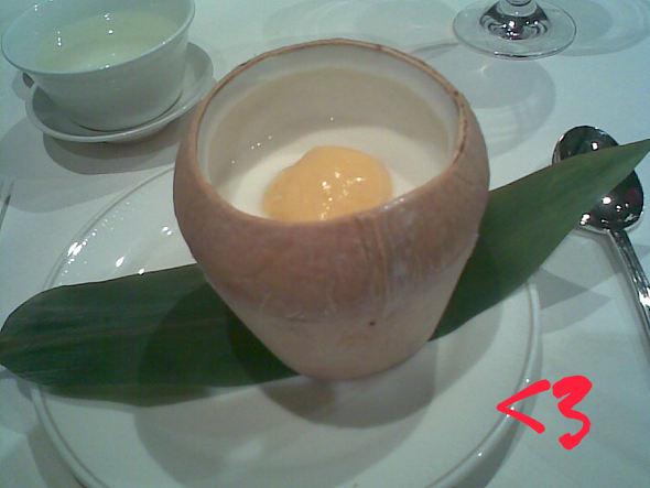 Complimentary desert from the chef! Inside the coconut got mango pudding, which is the round yelloow thing, got almond cream :D & oneh oneh. WDV you spell it. LOL.